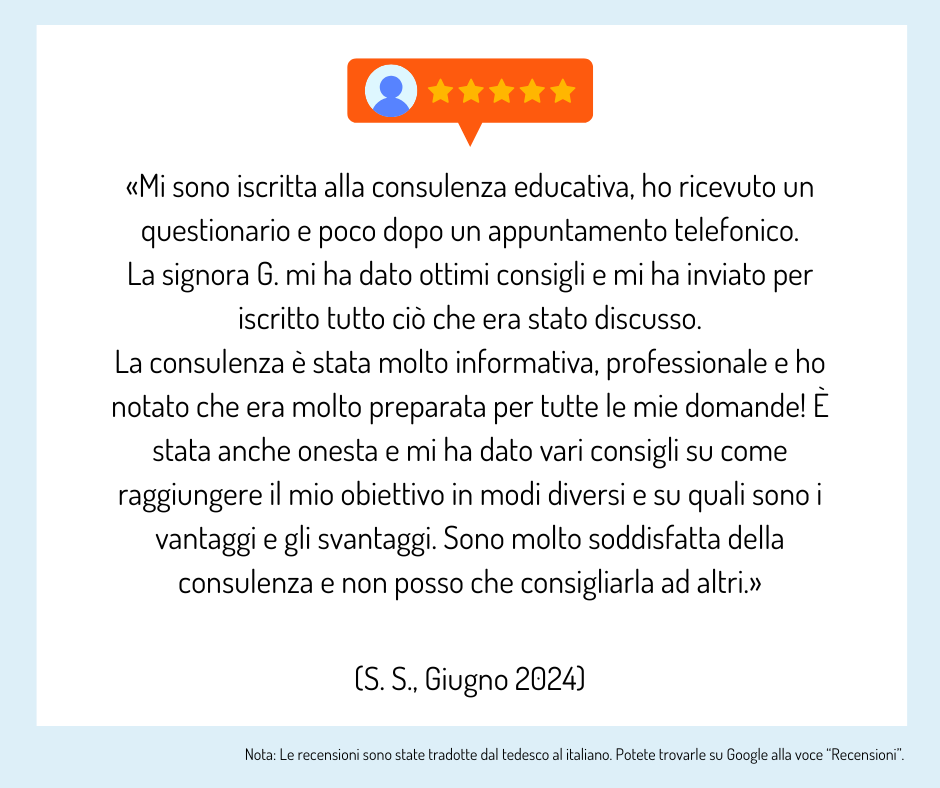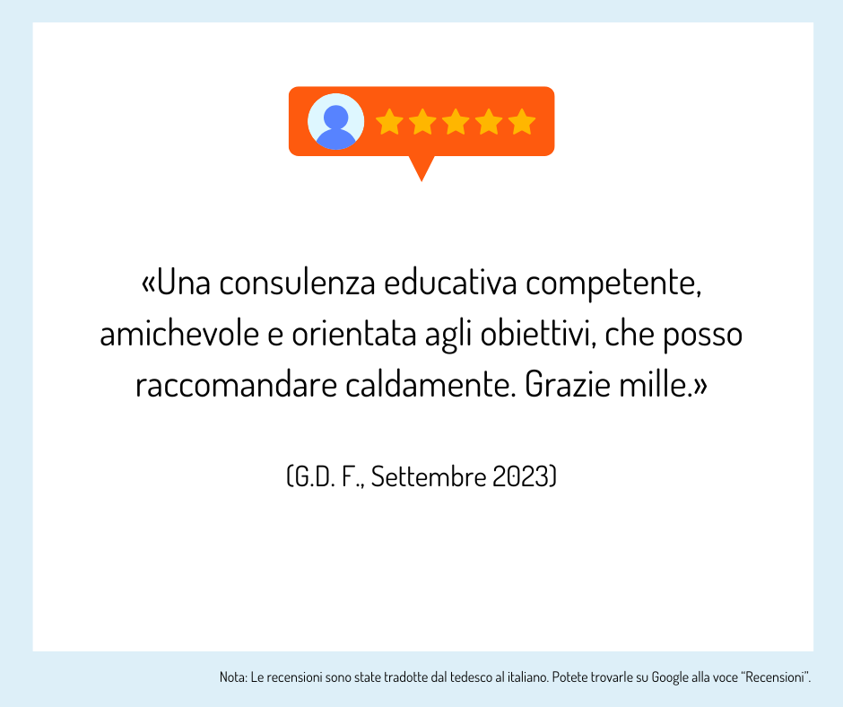 Il nostro team di consulenza educativa vi guiderà attraverso la "giungla educativa", fornendovi input specifici e informazioni di base sulla scelta dell'offerta giusta.